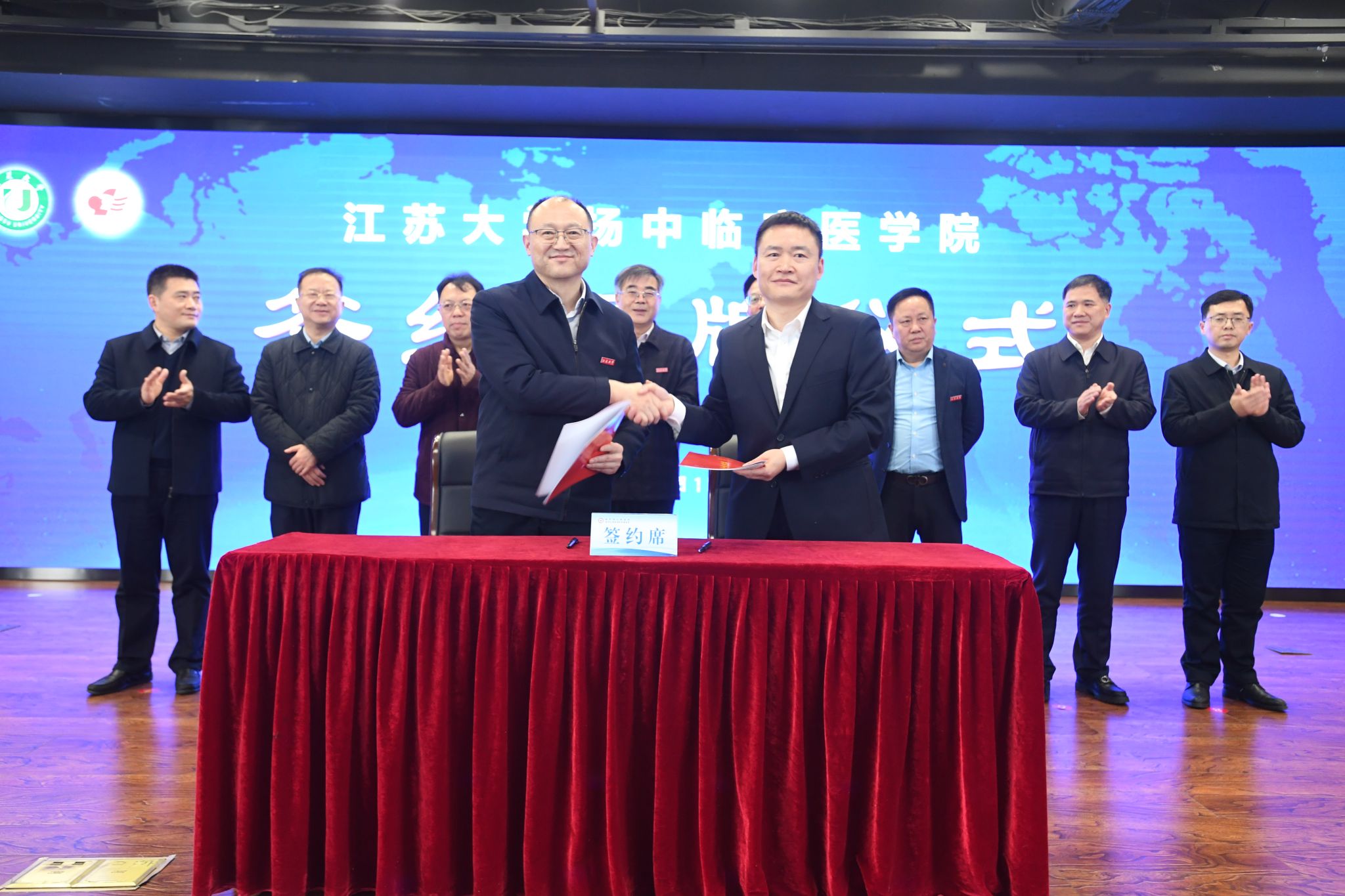 党委常委、组织部部长马志强、医学部常务副主任殷朝峰、附属医院院长陈吉祥、医学院副院长张徐,扬中市副市长姚建华、汪少华共同见证签约。