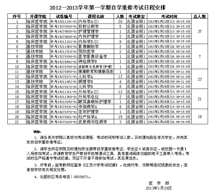 北固校区2012-2013学年第一学期自学重修考试日程安排