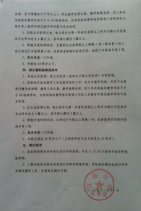 1.各医院按照条件和岗位进行考核推荐,并在11月29日前将申报材料报医学部;